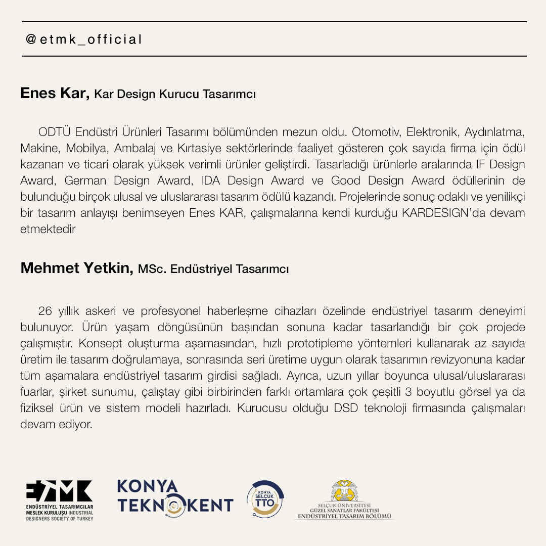 Endüstriyel Tasarımcılar Meslek Kuruluşu olarak, sektör profesyonellerini, akademisyenleri, tasarımcıları ve öğrencileri bir araya getireceğimiz 2. ETMK Sektör Buluşmalarını Konya’da düzenliyoruz.